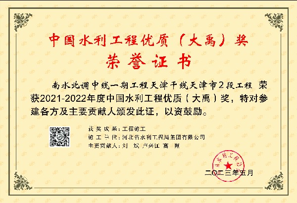 • 南水北調(diào)中線一期工程天津干線天津市2段工程榮獲大禹獎