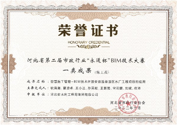 • 榮獲河北省第二屆市政行業(yè)“永通杯”BIM技術(shù)大賽一類成果