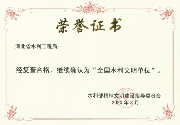 水工局以“育人興企,治水報國”為企業(yè)價值觀,踐行“忠實履約,精益求精”經(jīng)營理念,在激烈的市場競爭中潛心打造品牌。先后榮獲“全國文明單位”“全國水利系統(tǒng)文明單位”“全國優(yōu)秀水利企業(yè)”“全國水利建設(shè)市場‘AAA’級施工單位”“全國水利建設(shè)與管理先進(jìn)集體”“河北省建筑業(yè)先進(jìn)企業(yè)”“河北服務(wù)業(yè)企業(yè)100強(qiáng)”等榮譽稱號。